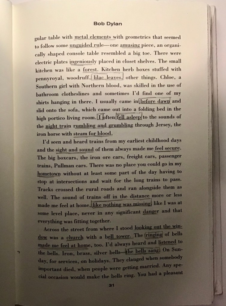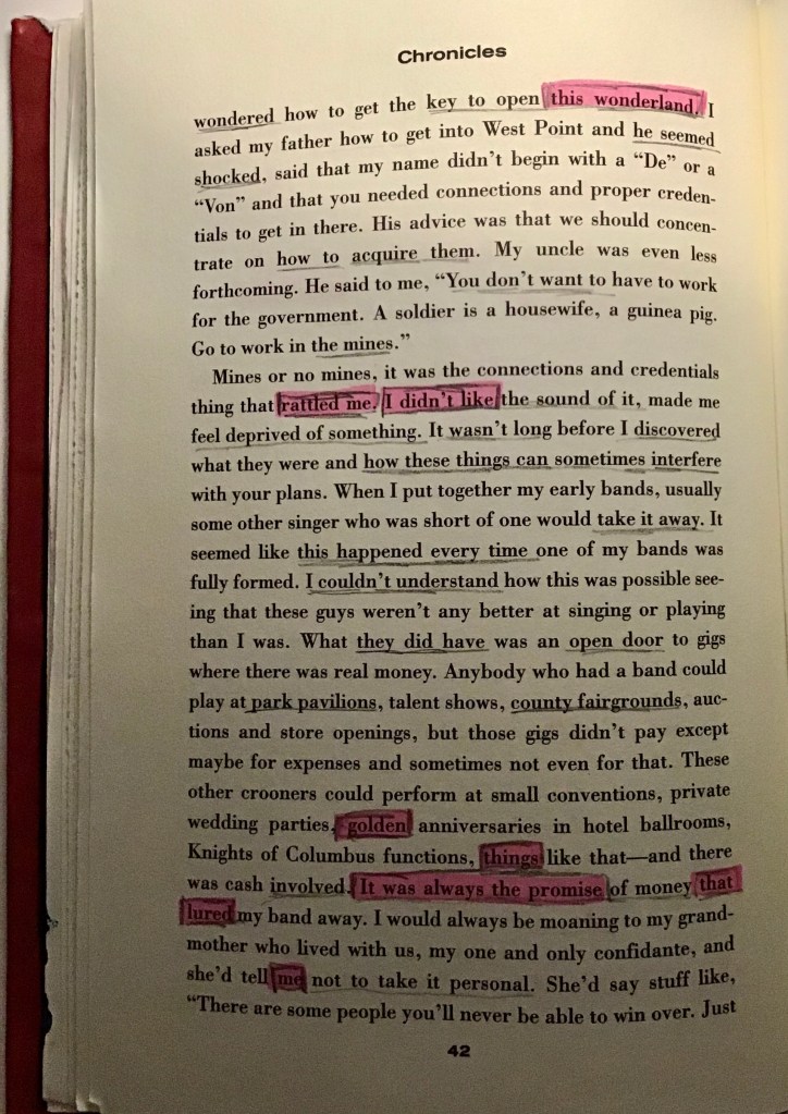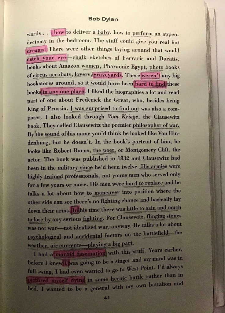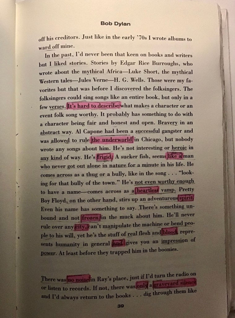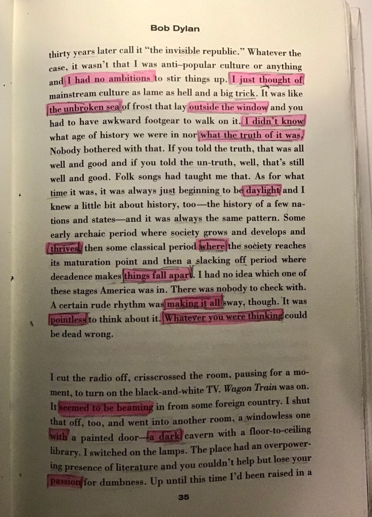 I’ve been doing some blackout poetry in a book by Bob Dylan called “Chronicles” It’s questionable how much credit one can take for their blackout poetry, so I will err on the safe side: The poems that you see below were written by none other than Bob Dylan.