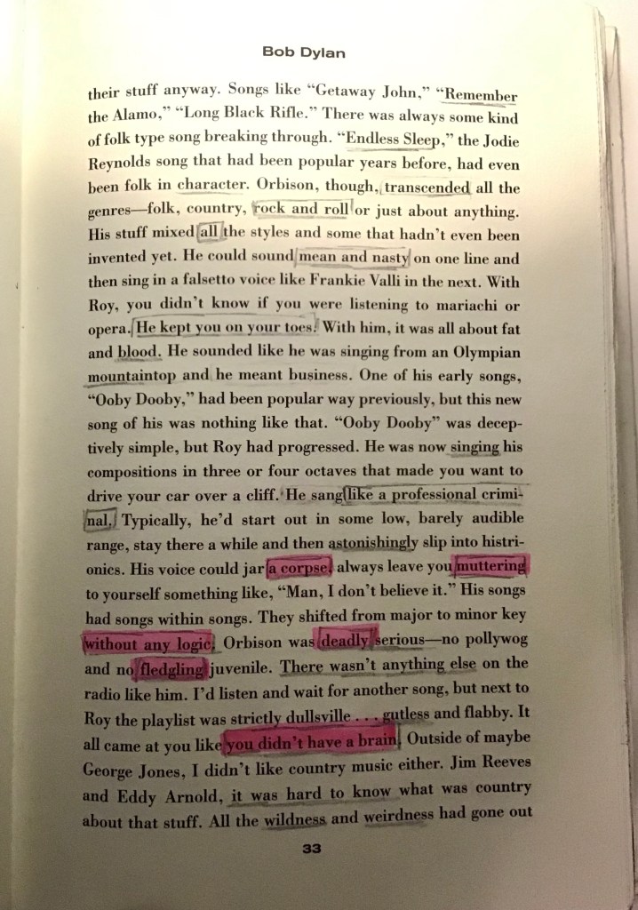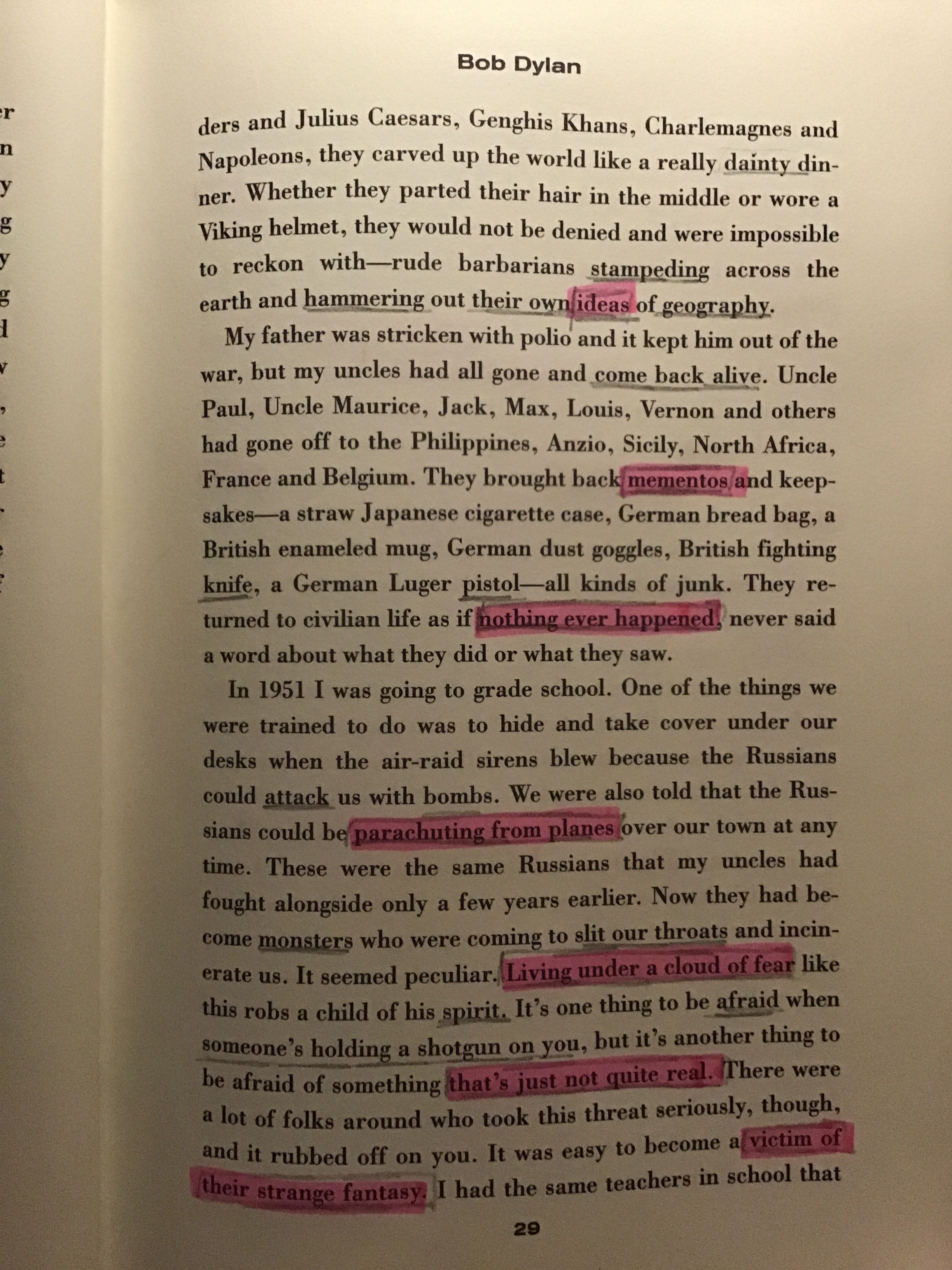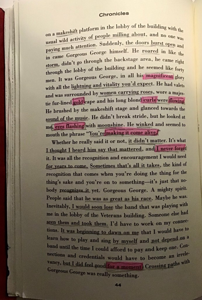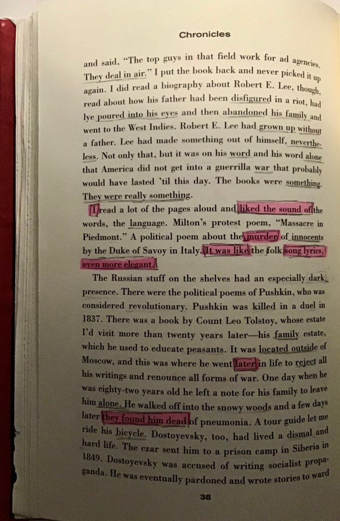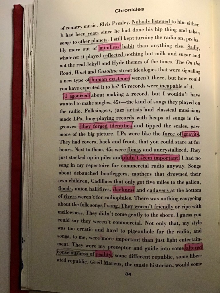 I’ve been doing some blackout poetry in a book by Bob Dylan called “Chronicles” It’s questionable how much credit one can take for their blackout poetry, so I will err on the safe side: The poems that you see below were written by none other than Bob Dylan.