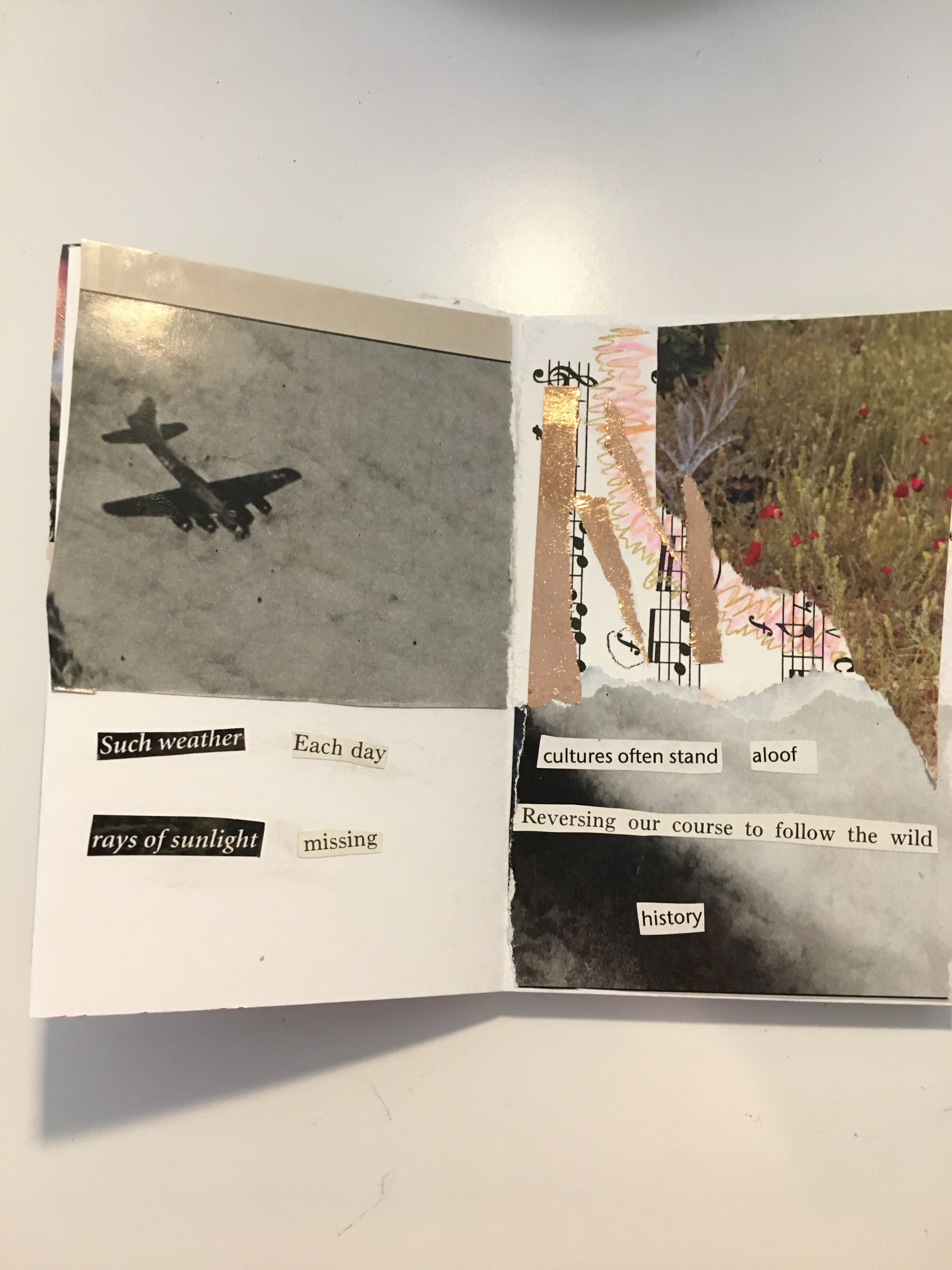 Once you’ve decided what your words are going to be, check out your image options. Look at what words you’ve decided will go on each page and decide what type of visuals you think will go well with them. Cut out photographs you like, color with markers, cover with glitter, and scribble all over. In mine, I used clips from the same images throughout to pull everything together. I also combined contrasting images, colored with pens and colored pencils, and added metallic washi tape. Again, so many possibilities. Add your image(s) to the page and then glue your words on top. Repeat for each page until your zine is complete!