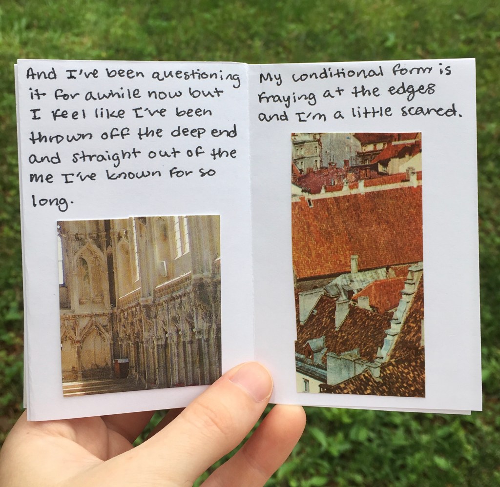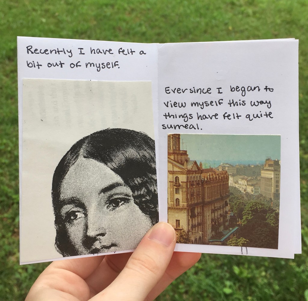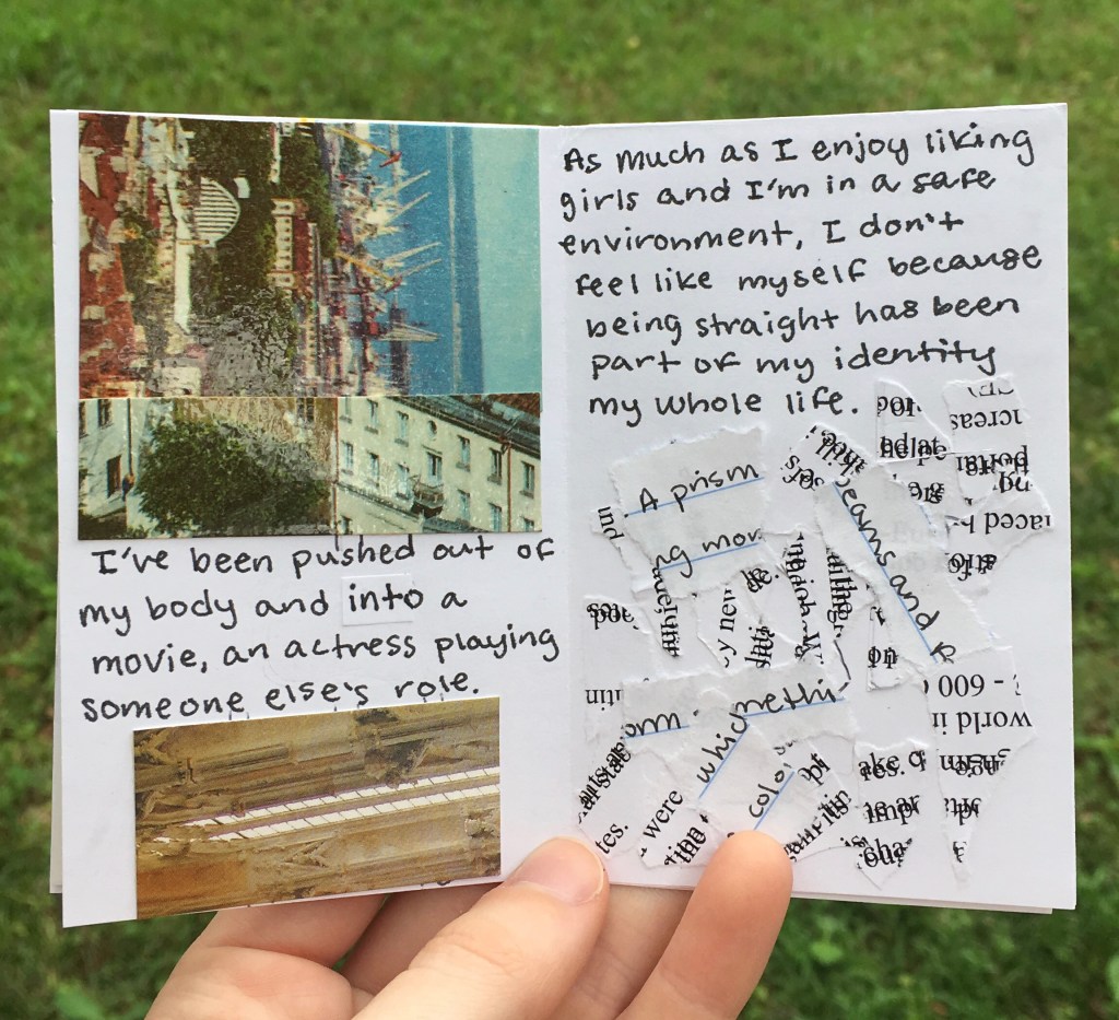 The “revelation” in question has to do with my identity, my sexuality, things that I don’t control but never took the time to ponder. But the whole point of making these zines is that they speak for themself. I don’t have to try to explain what I’m thinking with a simple paragraph. Instead, I can show people these little books and exchange my thoughts directly in a raw, authentic way, since most of them contain words that I wrote in my journal for no other purpose than to keep them there.