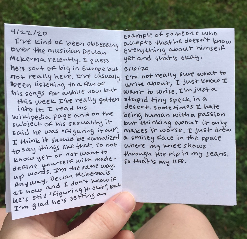 “I’ve kind of been obsessing over the musician Declan McKenna recently. I guess he’s sort of big in Europe but not really here. I’ve casually been listening to a few of his songs for awhile now but this week I’ve really gotten into it. I read his wikipedia page and on the subject of his sexuality it said he was “figuring it out”. I think it should be normalized to say things like that. To not know yet or not want to define yourself with made-up words. I’m the same way. Anyway, Declan McKenna is 22 now and I don’t know if he’s still “figuring it out”, but I’m glad he’s setting an example of someone who accepts that he doesn’t know everything about himself yet and that’s okay.” // “I’m not really sure what to write about, I just know I want to write. I’m just a stupid tiny speck in a desert. Sometimes I hate being human with a passion but thinking about it only makes it worse. I just drew a smiley face in the space where my knee shows through the rip in my jeans. So that’s my life.”