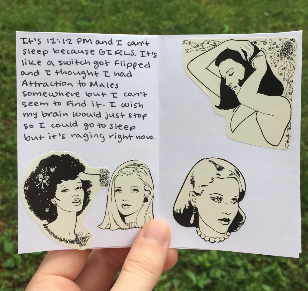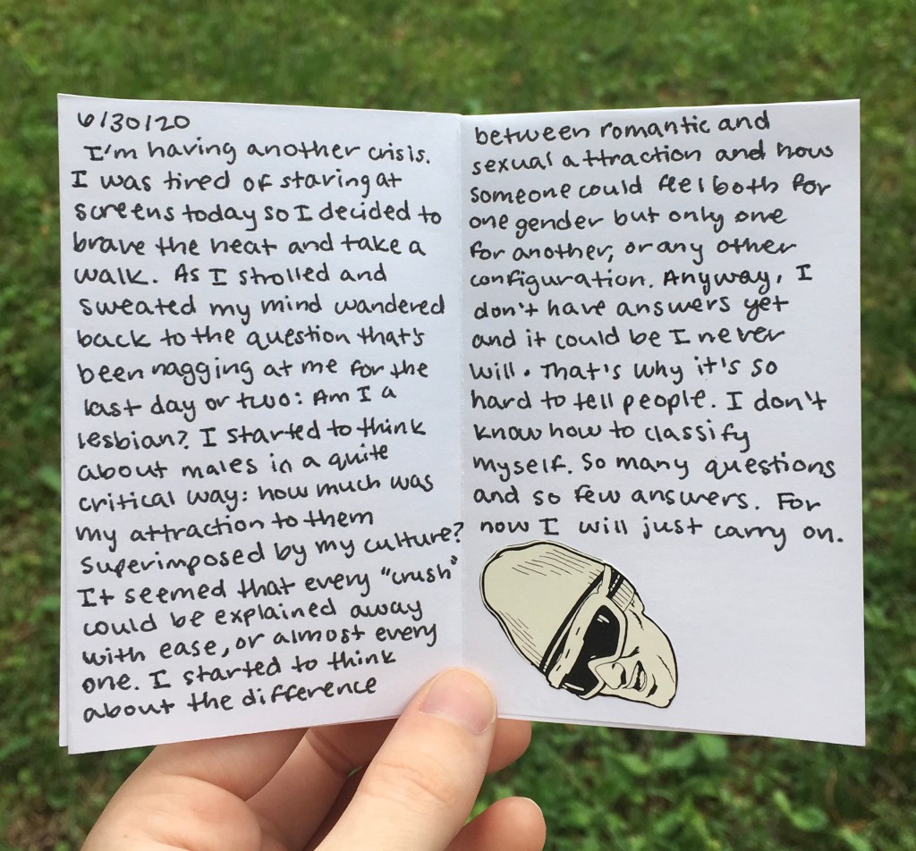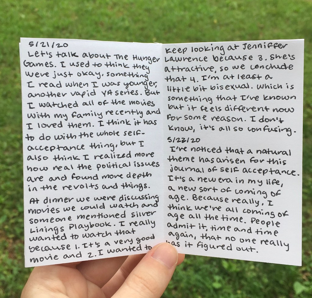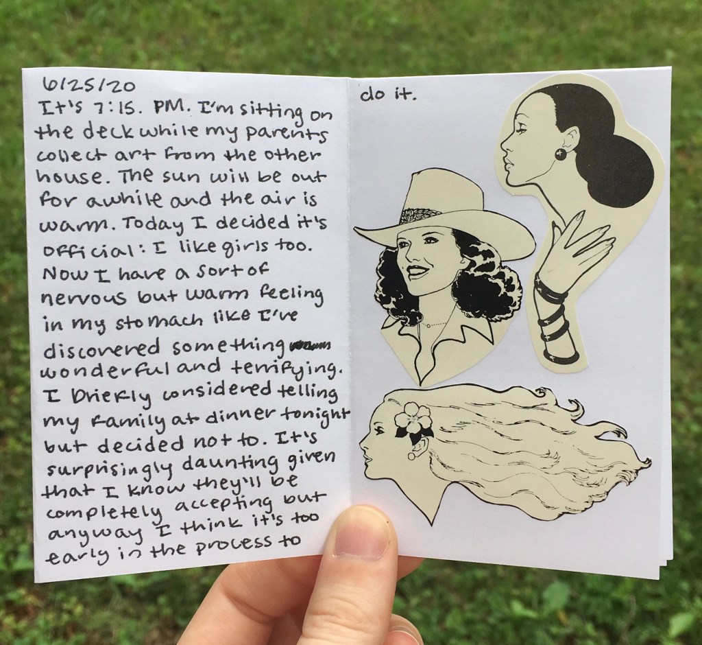 “It’s 7:15 PM. I’m sitting on the deck while my parents collect art from the other house. The sun will be out for awhile and the air is warm. Today I decided it’s official: I like girls too. Now I have a sort of nervous but warm feeling in my stomach like I’ve discovered something wonderful and terrifying. I briefly considered telling my family at dinner tonight but decided not to. It’s surprisingly daunting given that I know they’ll be completely accepting but anyway I think it’s too early in the process to do it.”