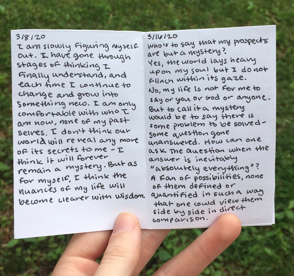 I suppose I have the coronavirus, in all its horribleness, to thank for this zine series. While the summer of 2020 has been apocalyptic, frustrating, and all-around miserable, it has also offered time and space for self-reflection, something that is often overlooked in the craziness of normal everyday life. Without the company of a couple thousand equally confused teenagers and the monotonous bustle of high school I’ve been able to look inside myself more deeply than ever before, and I’m sure, dear reader, that you have too.
