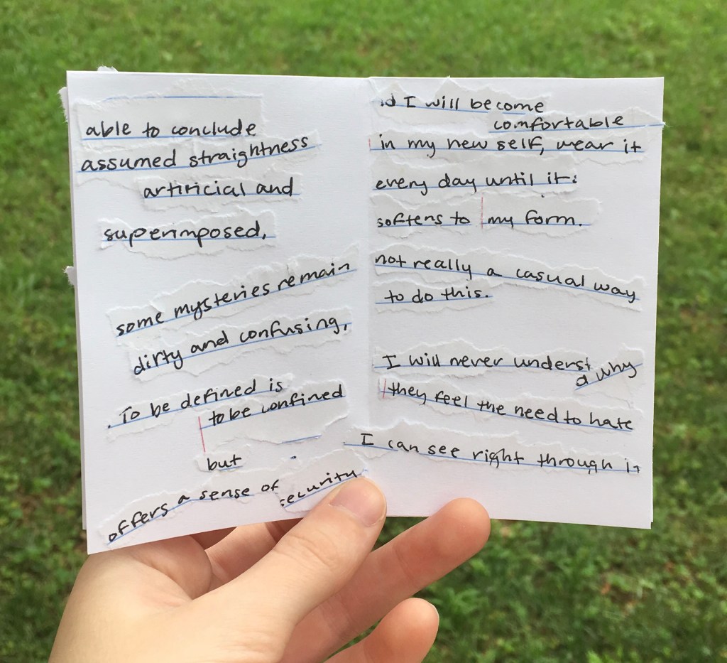 “able to conclude assumed straightness artificial and superimposed, // some mysteries remain // dirty and confusing // to be defined is to be confined but offers a sense of security. I will become comfortable in my new self, wear it every day until it softens to my form. // not really a casual way to do this // I will never understand why they feel the need to hate // I can see right through it.”