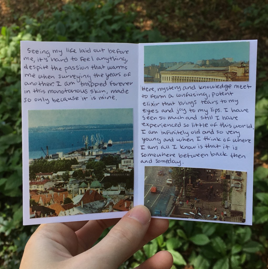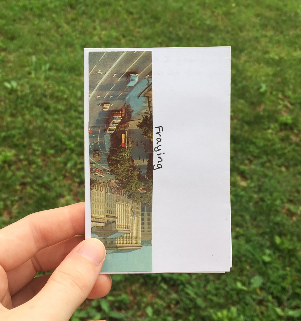 Part four is titled “Fraying”. It’s comprised of a single journal entry of mine, combined with pictures from old postcards. I chose the song Transatlanticism by Death Cab for Cutie to accompany it. My reasoning is that I just really really love the song and wanted to acknowledge it in some way. Also, the sadness and confusion of it goes well with the message in the zine.