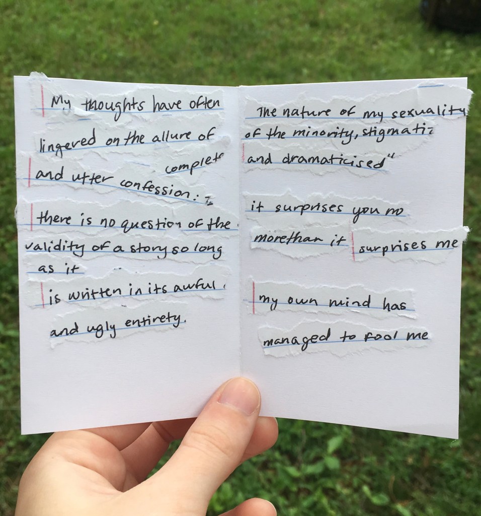 “My thoughts have often lingered on the allure of complete and utter confession: there is no question of the validity of a story so long as it is written in its awful and ugly entirety. The nature of my sexuality // of the minority, stigmatized and dramaticised // it surprises you no more then it surprises me // my own mind has managed to fool me.”