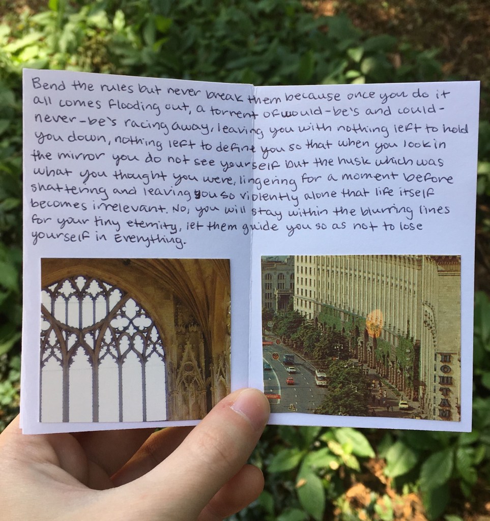Another reason why this zine series is a good way to express myself is that it allows me to show the uncertainty with which my thoughts have evolved, and also how things changed so quickly. What I was thinking during Untitled #1 is fairly different than what I was thinking during Untitled #2. It shows how art can be a more holistic form of communication than conversation in some cases.