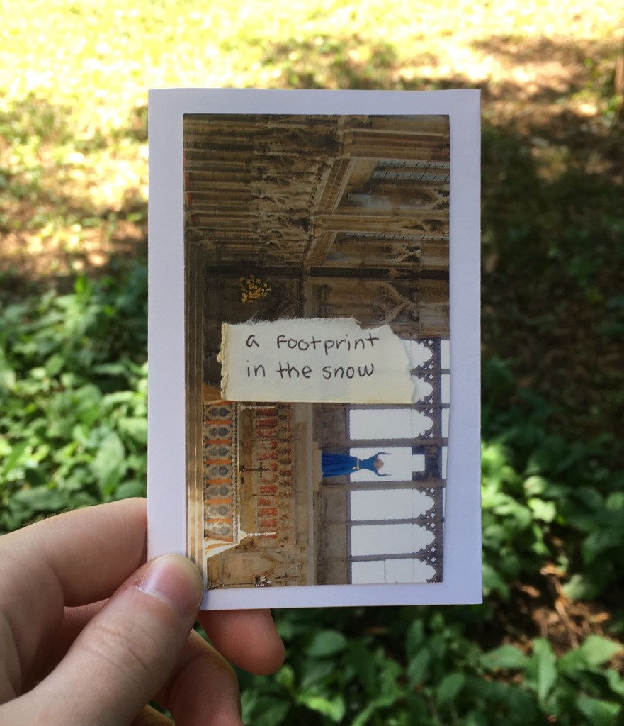 The pictures I used in A Footprint In The Snow are cutouts from postcards I found at an antique shop. Although the words don’t describe anything I would consider religious, the church architecture played into the idea of questioning and contemplating one’s existence. I consider A Footprint to be more of a preface than anything else. It doesn’t really touch on the topic that I’m ultimately trying to convey with the series but it sort of sets it up as something that should be taken seriously, but also taken with a sense of wonder, a reminder that nothing really makes sense anyway.